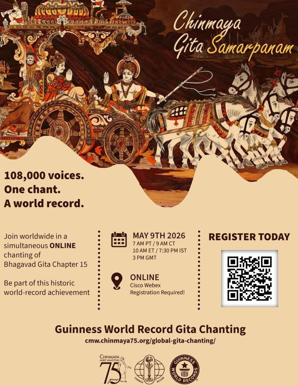On May 9, 2026 (7:30 p.m. IST / 7:00 a.m. PT), Chinmaya family members and friends from around the world will come together online to chant Chapter 15 of the Bhagavad Gita in unison. This is an official attempt to set a Guinness World Record for the largest number of people chanting online simultaneously.